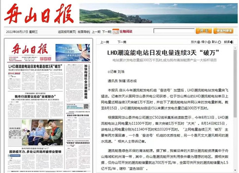 LHD 潮流能電站發電量突飛猛進!位於舟山的 LHD 潮流能電站單日上網電量近期連續3天突破1萬千瓦時,並創下了潮流能電站並網以來的發電量新高。截至8月15日,LHD 潮流能電站自運行以來累計發電總量已超300萬千瓦時。LHD海洋潮流能發電項目由浙江民革黨員林東擔任總工程師,帶領研究團隊歷經十年成功研發。