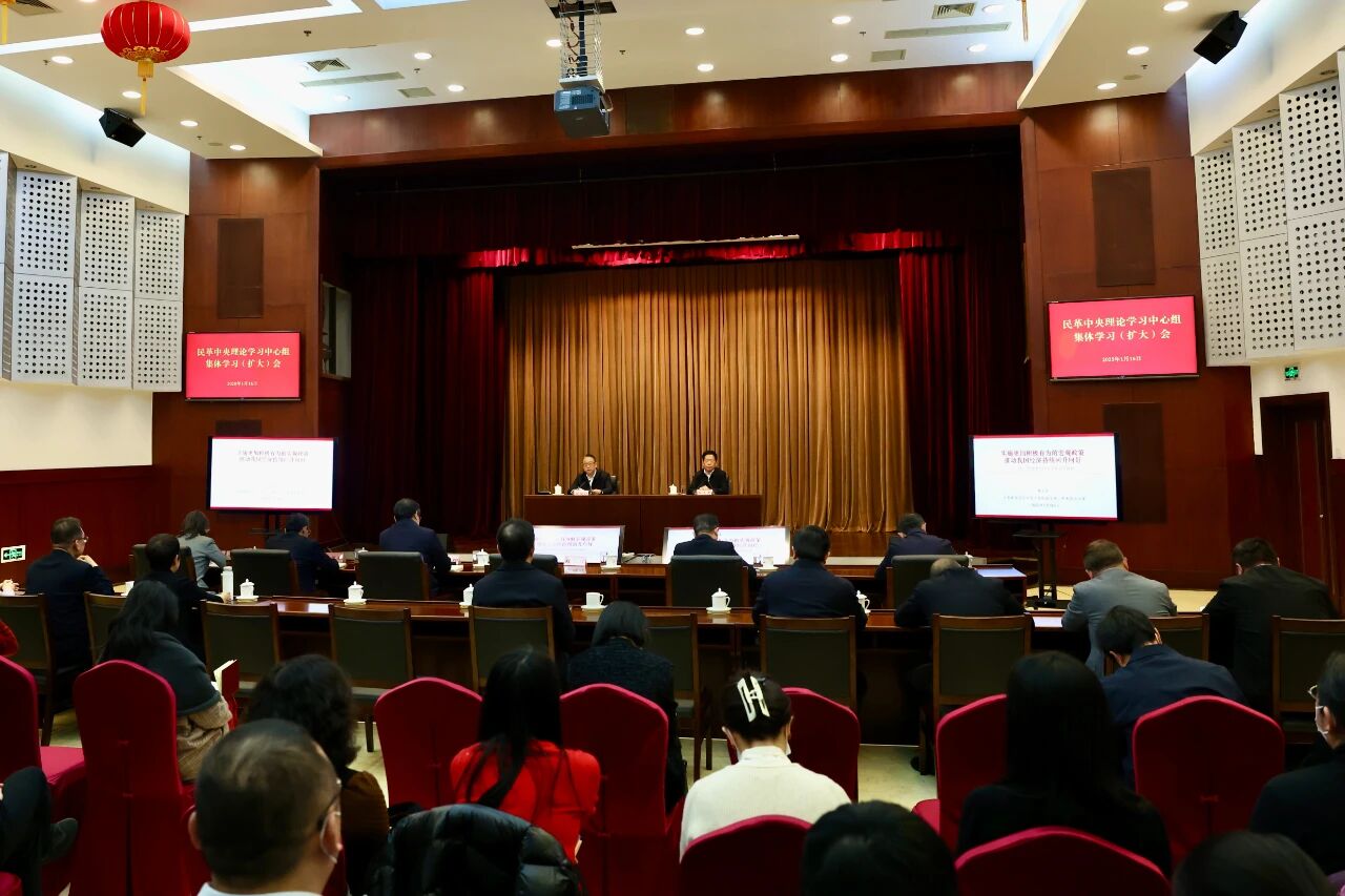 1月16日,民革中央理論學習中心組集體學習(擴大)會在京召開。會議以學習貫徹中央經濟工作會議精神為主題,是2025年度第一次集體學習。全國人大常委會副委員長、民革中央主席鄭建邦主持會議並講話。會議邀請中央財辦分管日常工作的副主任、中央農辦主任韓文秀作報告。全國政協副主席、民革中央常務副主席何報翔,民革中央副主席劉家強、李惠東、谷振春、陳星鶯參加會議。