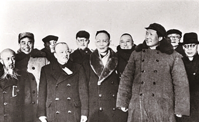 1949年3月25日,毛澤東率中共中央機關和人民解放軍總部進入北平,同前來迎接的民主黨派負責人和其他民主人士在西苑機場合影。左四為李濟深。