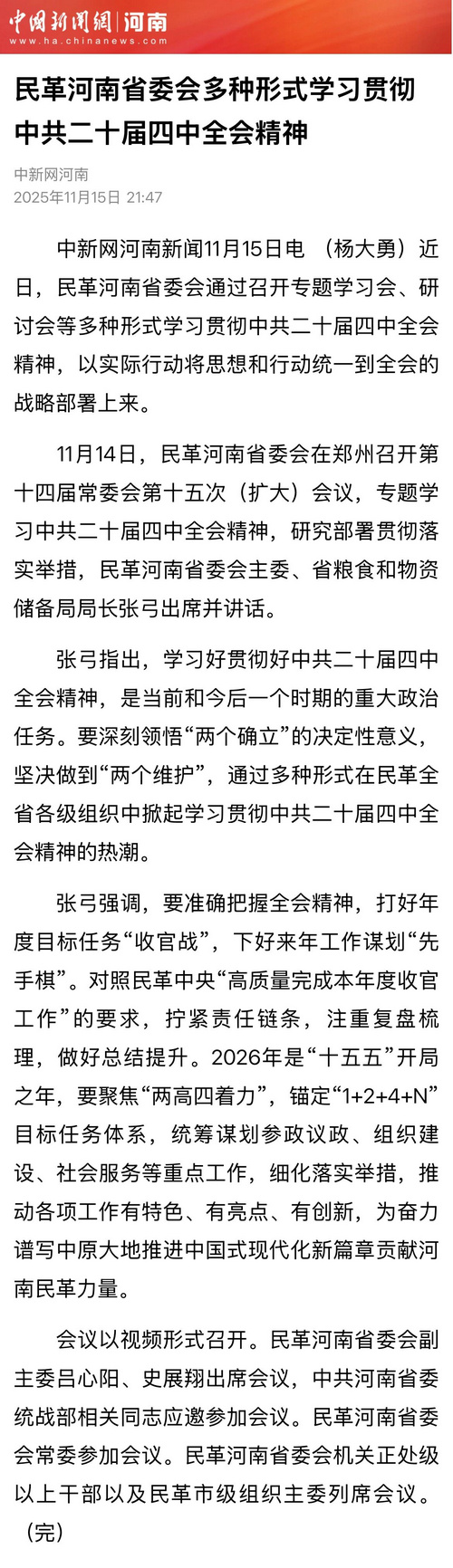 民革河南省委會召開第十四屆常委會第十五次(擴大)會議 專題學習中共二十屆四中全會精神