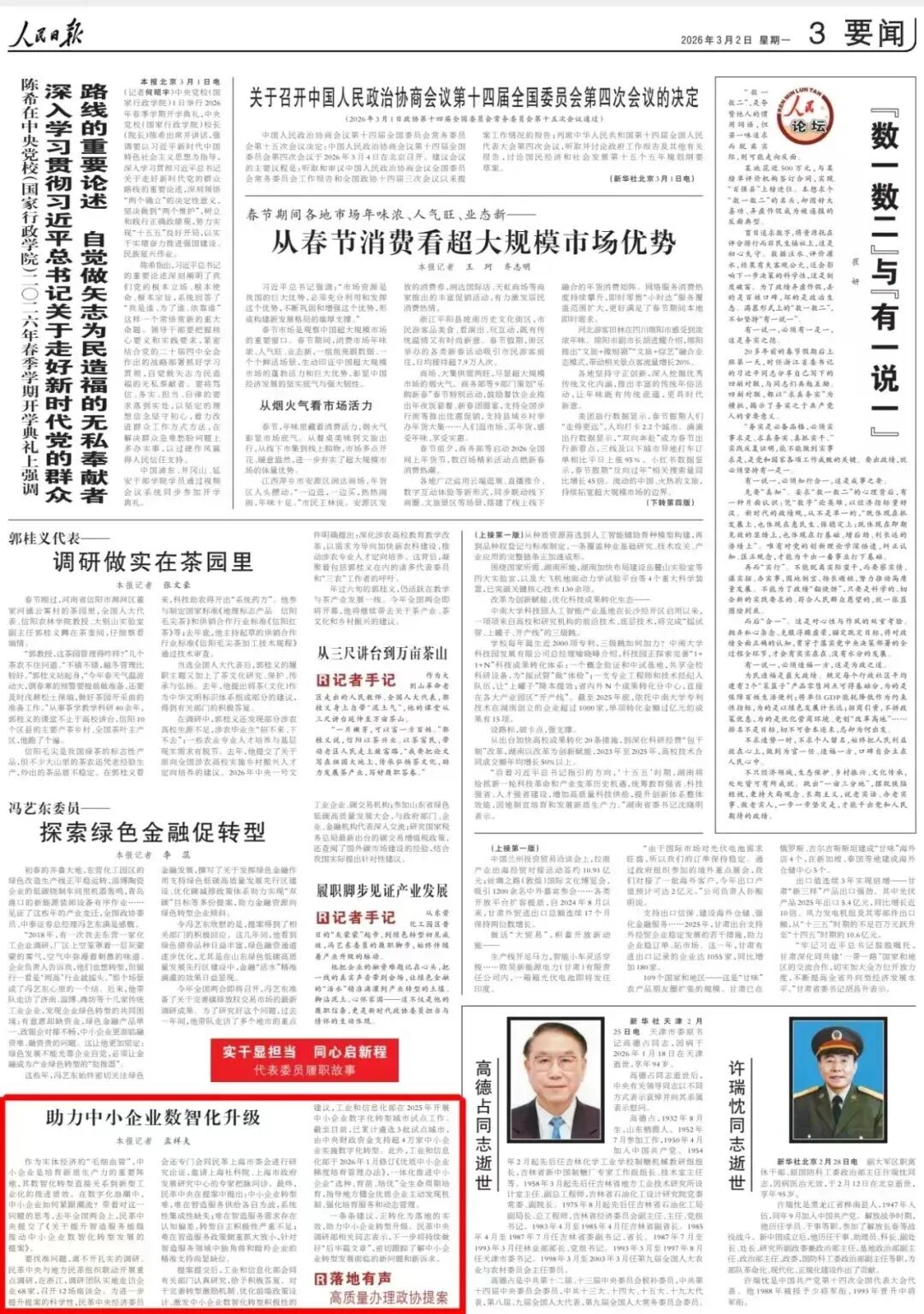 2026年3月2日,《人民日報》刊文介紹《關於提升智造服務能級 推動中小企業數智化轉型發展的提案》的背后故事。