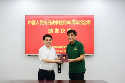 在纪念中国人民抗日战争暨世界反法西斯战争胜利80周年之际,根据国家公布的纪念活动安排,以中共中央、国务院、中央军委名义,为健在的抗战老战士、老同志、抗战将领或其遗属颁发“中国人民抗日战争胜利80周年”纪念章。9月2日,民革湖南省委会在长沙举行纪念章颁发仪式。民革湖南省委会主委蒋涤非出席,民革湖南省委会专职副主委范泽容主持,全体机关干部参加仪式。