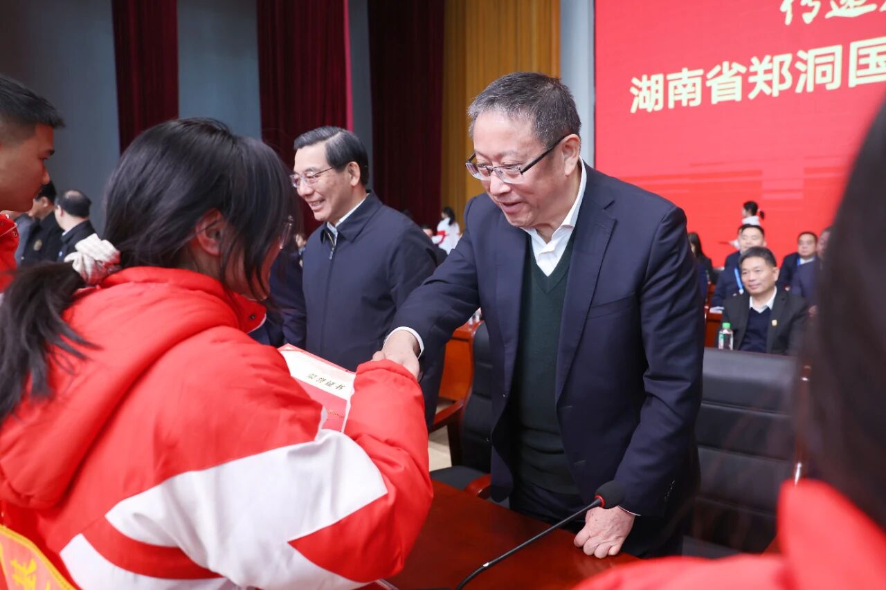 郑建邦对湖南各级党委、政府及社会各界爱心人士长期以来对石门教育事业发展的关心支持表示感谢,向获表彰师生表示祝贺。他指出,“十五五”时期是基本实现社会主义现代化夯实基础、全面发力的关键时期,当代青年学子生逢其时,肩负着光荣而艰巨的历史使命。他对同学们提出“修身、养志、勤学、笃行”的殷切期望,勉励他们继承和发扬革命先辈的崇高精神,自觉将个人理想融入国家发展大局,牢固树立为强国建设、民族复兴而读书的坚定信念,在勤奋学习中增长才干,在脚踏实地中砥砺前行。希望全校师生凝心聚力、奋发有为,共同将石门一中这面旗帜举得更高、擦得更亮,不断开创学校教育事业发展新局面。