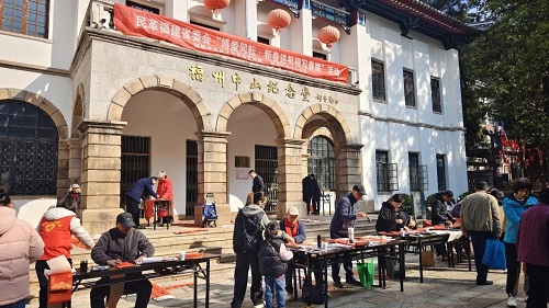 2月9日,民革福建省委会在福州中山纪念堂前举办“博爱同耘·新春送祝福写春联”活动,邀请福建省逸仙艺苑书法院书法家为群众现场写春联、送“福”字。