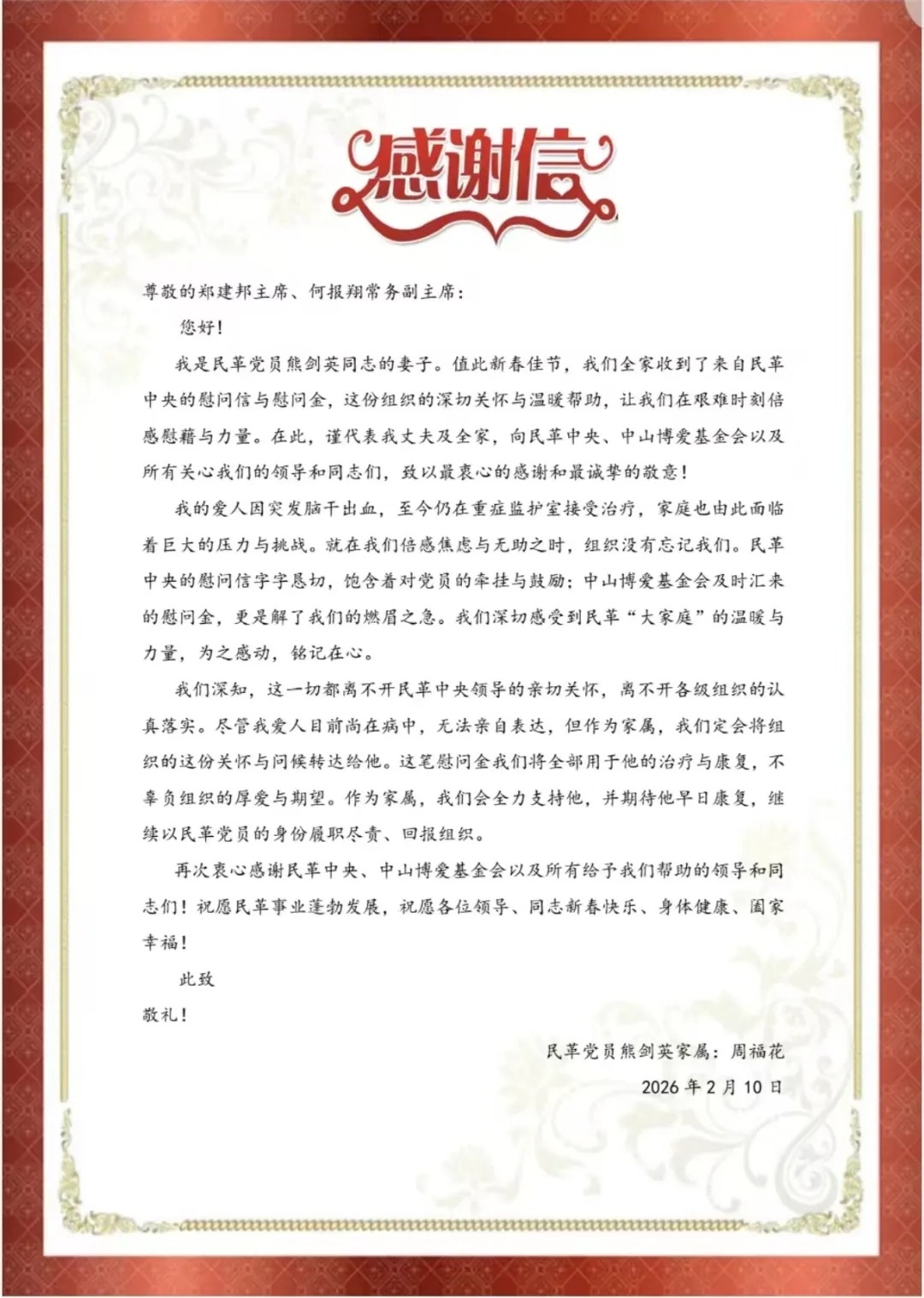 郑建邦、何报翔在慰问信中表示,过去的一年,是民革全党同心同德、砥砺奋进的一年。广大党员始终坚持以国家发展、民族复兴为己任,立足本职,服务社会,积极履行参政议政、民主监督、参加中国共产党领导的政治协商职能,为民革事业的发展和国家现代化建设贡献了智慧和力量。了解到部分同志目前生活面临一些暂时的困难,中央领导班子高度重视,要求各级组织切实关心党员,特别是困难党员的生活状况,尽最大努力为大家排忧解难。各级组织积极贯彻落实相关要求,进一步建立健全关怀帮扶机制,努力为大家提供必要的支持和帮助,与大家共渡难关。